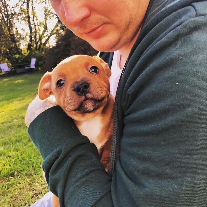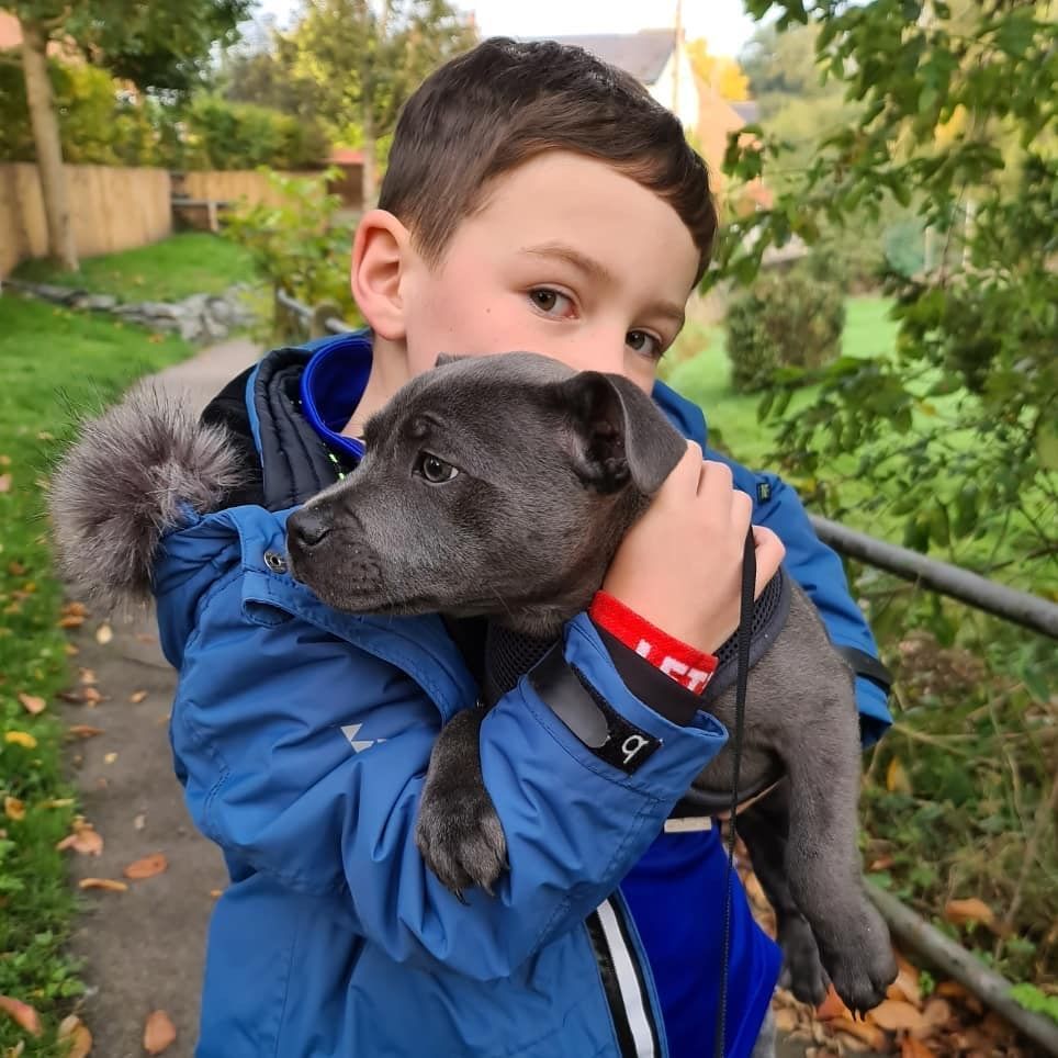 English Staffy Home did an incredible job preparing our puppy, Finn, for life with a new family. He came with all his health documentation and a detailed schedule to keep his routine consistent. Finn is affectionate, friendly, and wonderfully balanced in temperament. He sleeps well, eats well, and loves every bit of attention he gets. Excellent breeder and excellent experience.